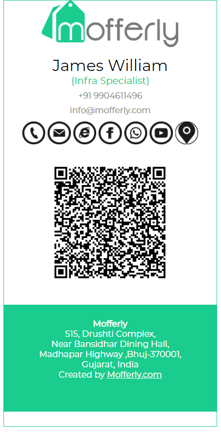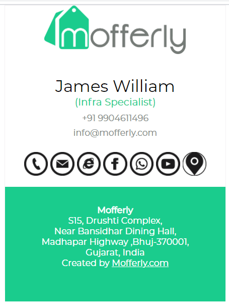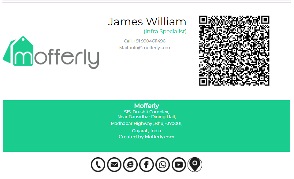 Your digital business card will contain business name, brand logo, contact info such as email id, phone number, address. It may also contain QR Code, which can scanned and contacts can be added to phone quickly. Digital visiting card may clickable buttons to make call , send email and chat.